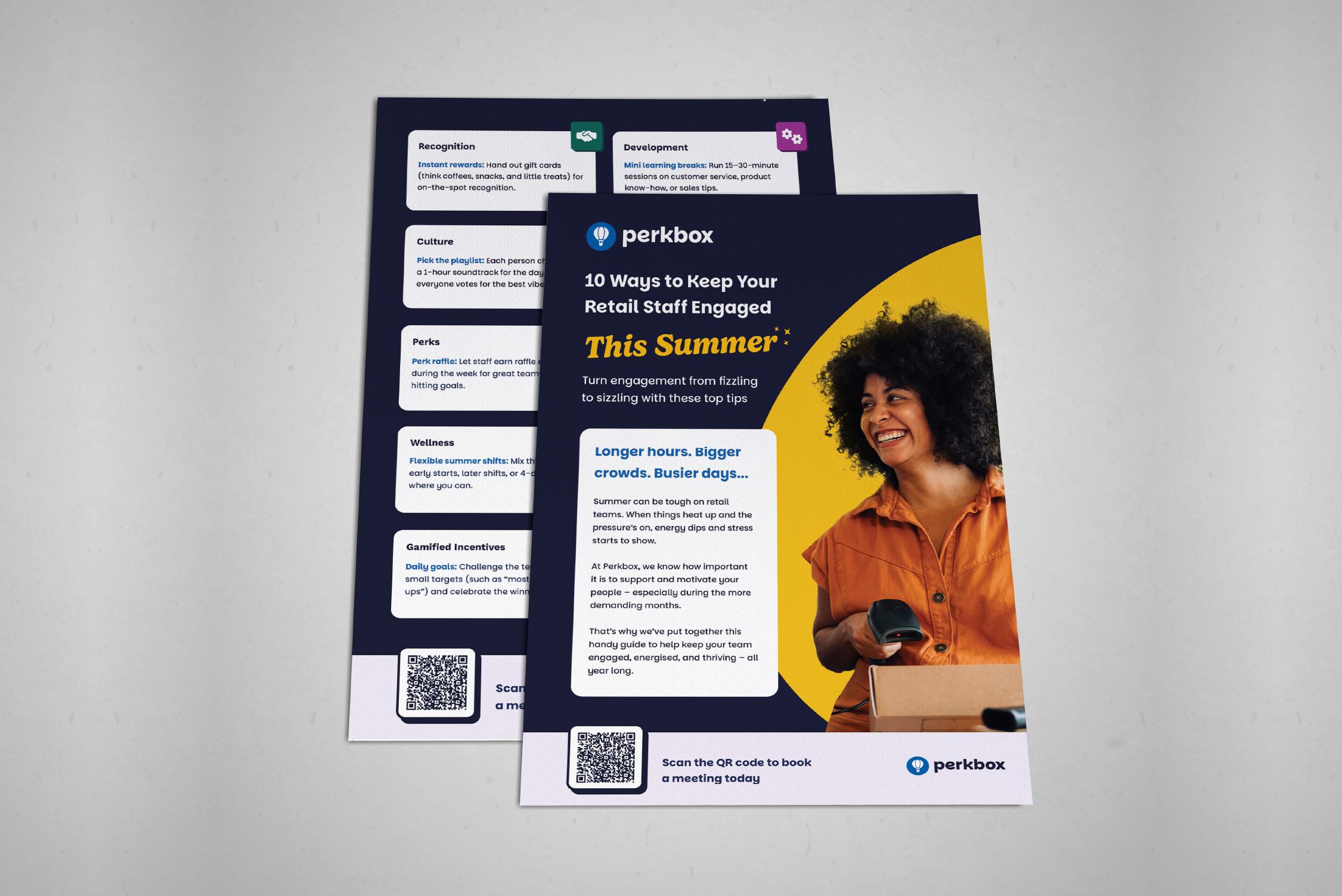 When approaching this flyer design for Perkbox, I focused on aligning the visual style closely with the updated brand identity while ensuring the layout remained engaging and easy to navigate. The bold colour palette and curved graphic shapes help reinforce the modern Perkbox branding while creating a strong visual contrast that draws attention to key areas of the page. I structured the content using clear sections and card-style blocks, allowing information to be broken down into digestible points so readers can quickly scan the flyer. The large headline and supporting imagery help establish the theme immediately, while the QR code call-to-action provides a clear next step for users. Overall, the goal was to balance brand consistency with a clean, structured layout that keeps the content visually appealing and easy for readers to engage with.